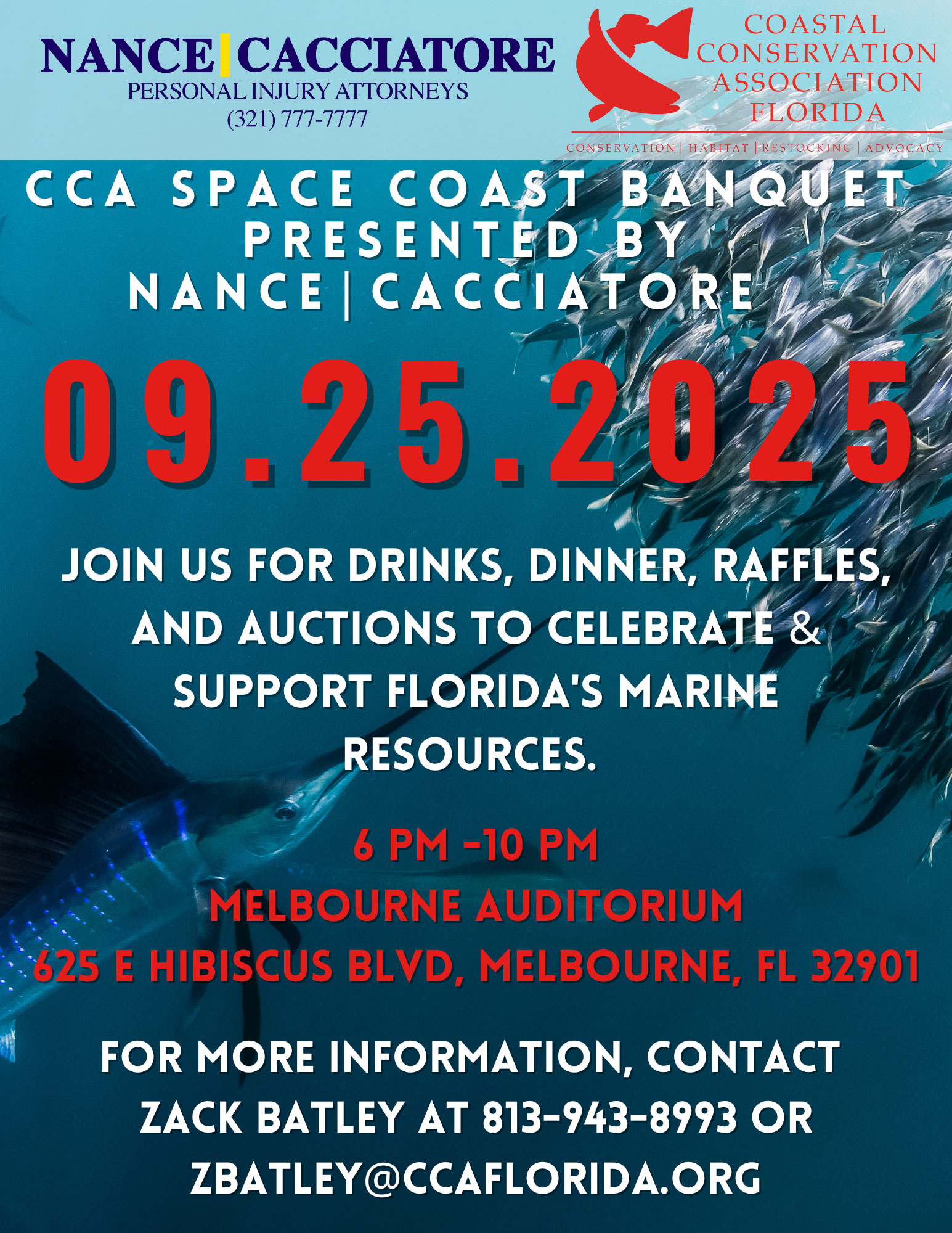 Join us for drinks, dinner, raffles, and auctions to celebrate & support Florida’s marine resources during the 2025 Space Coast Banquet and Auction. Your ticket includes a one-year membership to CCA Florida, open bar, oysters, appetizers, steak dinner, and an entry to the event of the year! The banquet will feature an expansive silent auction, exciting raffle prizes, and a spectacular live auction with exclusive trips all over the state, country, and world! Please join us in celebrating and supporting Florida’s marine resources during this evening you will not want to miss!