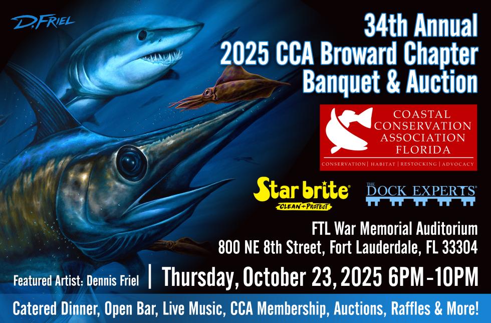 Please join us for the CCA Broward Chapter Banquet & Auction at the FTL War Memorial Auditorium in Fort Lauderdale, FL on Thursday, October 23rd from 6:00pm – 10:00pm! Guests will enjoy an exquisite dinner, open bar, live music, auctions, raffles and more as we celebrate and support Florida’s marine resources!