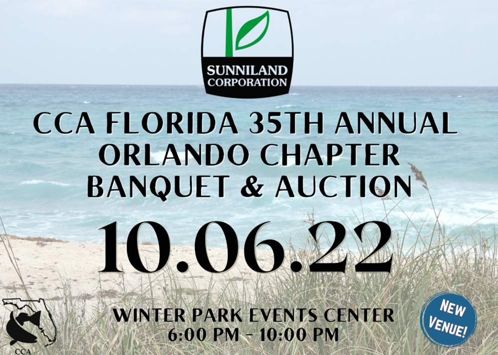 Reserve your place now for The Sunniland CCA Florida Thirty Fifth Annual Orlando Banquet & Auction! This is an event that you will not want to miss and it is all being held at the new Winter Park Events Center. Your ticket includes a delicious meal by Arthur’s Catering, open bar, a one-year CCA membership, auctions, raffles and much more!