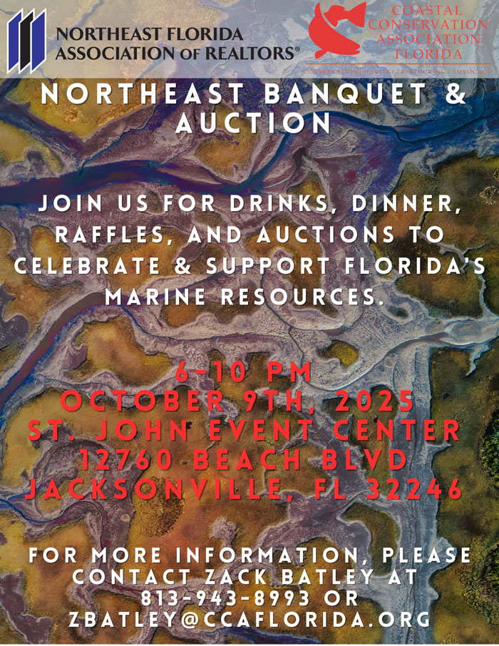 Join us for drinks, dinner, raffles, and auctions to celebrate & support Florida’s marine resources. Your ticket includes a one-year membership to CCA Florida, open bar, steak dinner, and an entry to the event of the year! The banquet will feature an expansive silent auction, exciting raffle prizes, and a spectacular live auction with exclusive trips all over the state, country, and world! Please join us in celebrating and supporting Florida’s marine resources during this evening you will not want to miss!