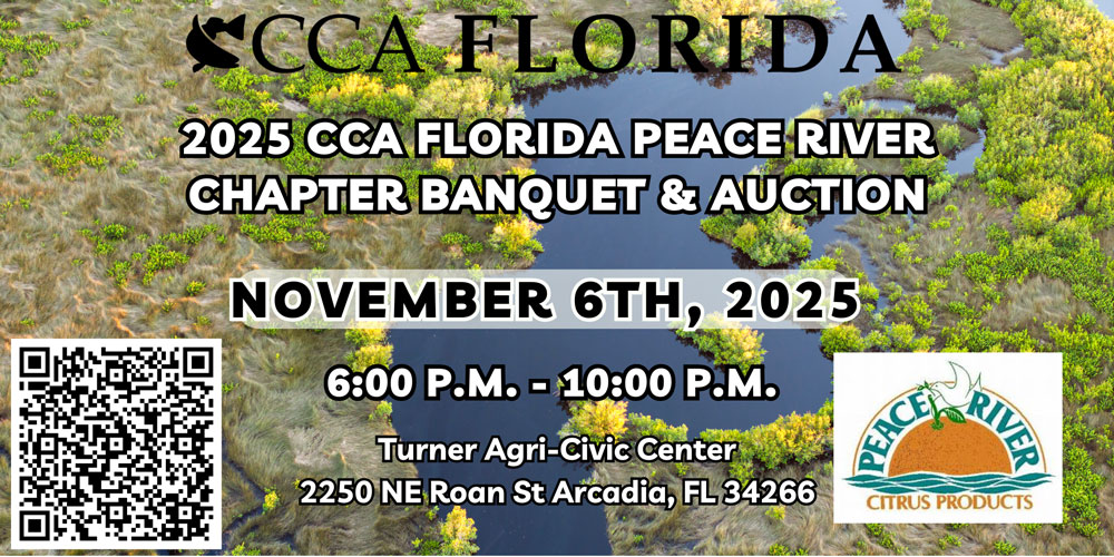 The annual Peace River Chapter banquet and auction presented by Peace River Citrus will consist of raffles, a silent auction, live auction, dinner, and bar. Funds raised will support CCA Florida’s efforts in conservation of our marine resources. Come on out, show your support and have a great time!