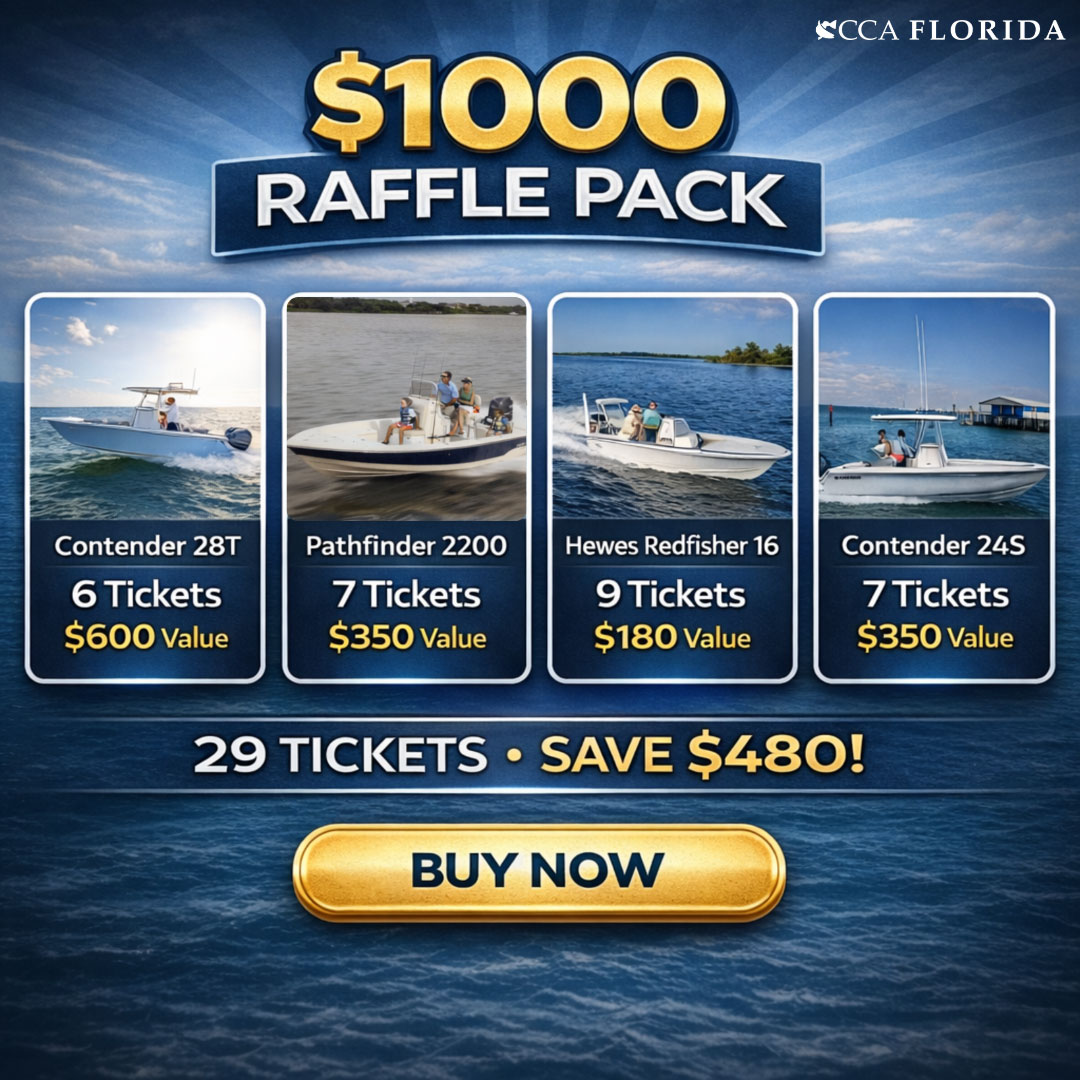 Pursuant to the laws of Florida, no purchase or contribution is necessary to enter the Raffle drawing. A Ticket may be obtained by mailing a request for free raffle tickets (one letter PER raffle) with a self-addressed, stamped envelope and notating the specific raffle ticket selection and ticket quantity to Coastal Conservation Association Florida, ATTN: Raffle Ticket Request, P.O. Box 568886, Orlando, FL 32856. The ticket(s) will be mailed to you for completion. Tickets MUST be returned, ONE per envelope, to the same address to qualify for the selected raffle.