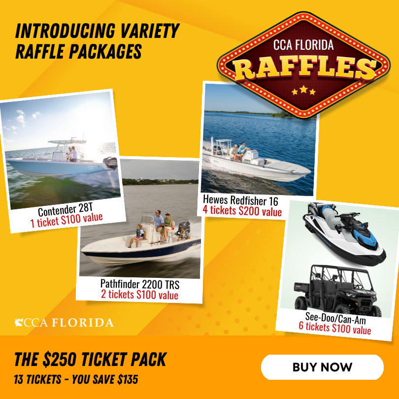 Explore the ultimate collection of raffle ticket packages, designed to offer you both excitement and value. By purchasing these raffle packages, you can save money while supporting vital habitat projects across the state. Each package directly contributes to the funding of crucial conservation initiatives, aimed at mangrove and seagrass plantings, shoreline stabilizations, artificial reefs, waterway and shoreline trash clean ups, restocking clams, oysters, redfish and seatrout, and more.